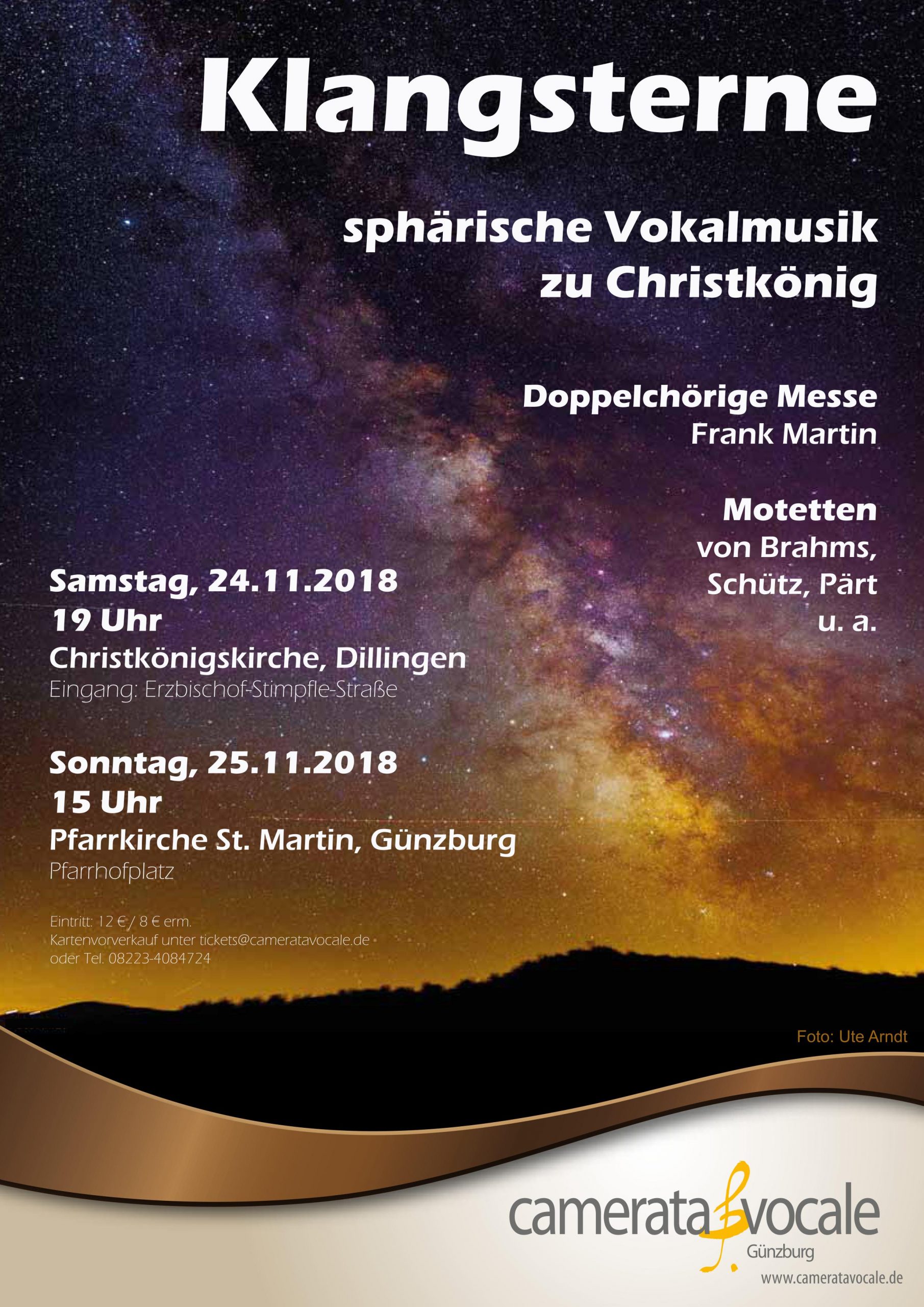 Wir laden Sie sehr herzlich zu unserem neuen Konzertprogramm „Klangsterne – Sphärische Vokalmusik zu Christkönig“ am Samstag, den 24. November 2018, um 19 Uhr in der Christkönigskirche bei Regens-Wagner in Dillingen/Donau und am Sonntag, den 25. November 2018, um 15 Uhr in der Pfarrkirche St. Martin in Günzburg ein. Genauere Informationen dazu finden Sie unter „Konzerte“.