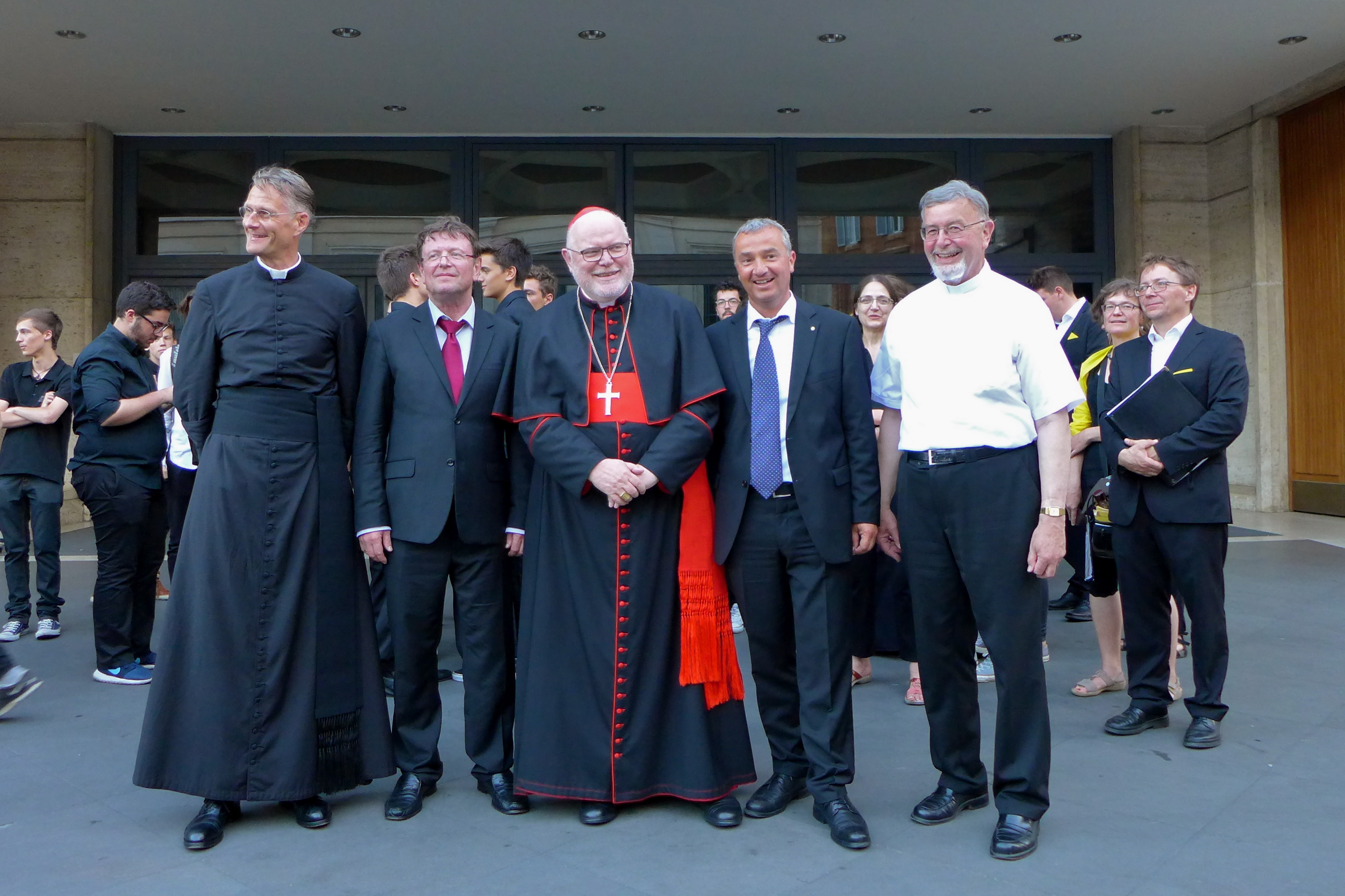 (v.l.n.r.: Dr. Hans-Peter Fischer, Rektor des Campo Santo Teutonico, Chorleiter der camerata vocale Jürgen Rettenmaier, Zelebrant Kardinal Reinhard Marx, Oberbürgermeister der Stadt Günzburg Gerhard Jauernig, Monsignore Gottfried Fellner als begleitender Geistlicher der Pilgerreise)